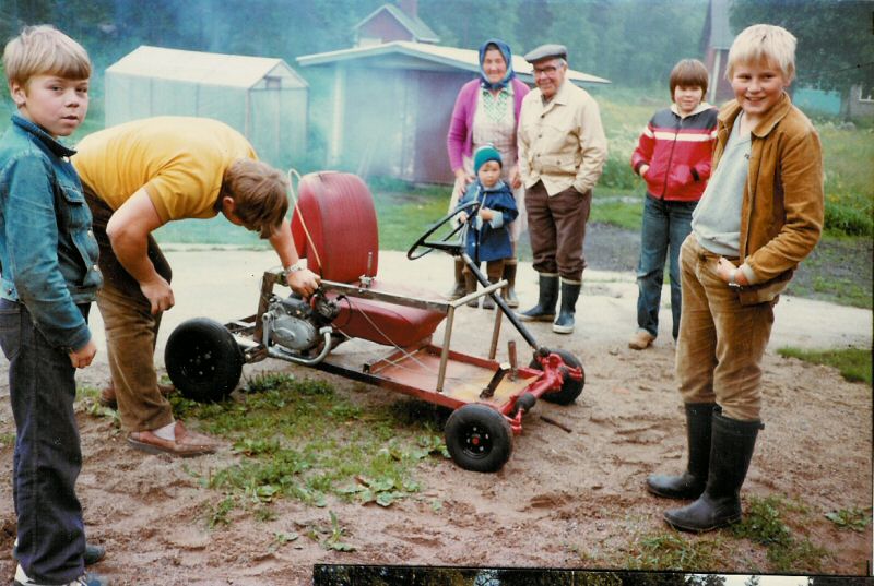 Jisses vad jag körde med den bilen. Kunde snurra på med den flera timmar per dag. Körde slut på första motorn efter några år och då bytte vi till en treväxlad SACHS motor med kickstart. Då kunde jag sitta kvar i bilen och starta med högerhanden. Det gick att backa med den också. Om man rullade den bakåt nedför en backe och satte i växeln starta motorn fel väg. Motorn var förståss svagare bakåt men det gick.