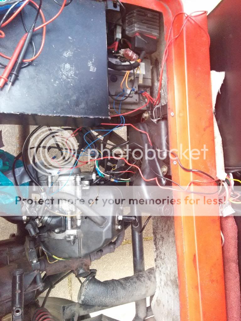 Bifogar en stor bild nedan i en länk.. på den syns 2 orangea sladdar som går in i regulatorn.. dom har tidigare gått via dom gula sladdarna på bilden.. nånstans.. ingen aning om var.. han som rev det ligger på sjukhus nu och han har inte lyckats få igång det innan heller..