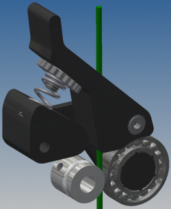 Det som många dock inte tänkt på är att de flesta (alla vi har sett) använder små kullager. Det gör att anläggningsytan mot plasten blir väldig liten och trycket mot matningsdrevet väldigt koncentrerat. Genom att sätta dit ett kullager med större diameter så får man en mycket säkrare matning med vissa plaster, främst hårda och spröda som kräver att många kuggar tar tag i plasten samtidigt. Det finns dock en nackdel med stort kullager och det är att det sticker ut från extrudern, detta kan ställa till med problem vid monteringen, speciellt om man vill köra dubbla extruders. Vi har även valt att inkludera en tumskruv för att kunna modifiera fjäderspänningen.