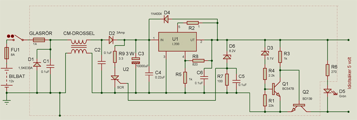 Lysdiod D5 indikerar funktion samt dränerar kondensator C3 vid spänningsbortfall.