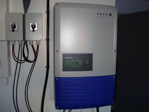 Invertern är en KACO Powador 12.0 TL3. Den har två stycken "Maximum power point tracking" (MPPT) vilket passar bra för de två slingorna. En slinga skall ligga på mellan 200 - 800 volt. Dock krävs minst 250 V för att den skall starta. Max effekt in är 12 kW och maximalt 10 kVA ut i form av 3-fas, 3 x 230 V, 3 x 14,5 A. Verkningsgraden är cirka 98%.