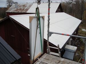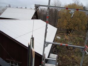 Panelerna väger endast 19,5 kg så placering går lätt. Här är högra takhalvan påbörjad. Tyvärr blev bilden lite suddig.