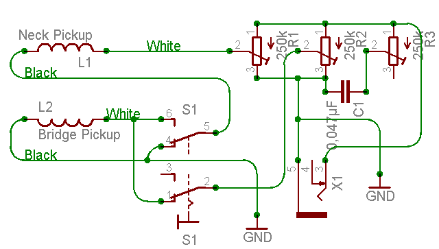 Det vanliga är att man jordar mot baksidan av potentiometrarna, men för en pålitlig lösning rekommenderas att alla jordar löds mot en gemensam lödpunkt, t.ex. lödörat på utgångsjacket eller en skruv som skruvas in i träkroppen, som sedan ansluts till kontollplattan och kopparskölden (om sådan finns). Microfonernas jordar (svart kabel) bör dras separat till jordpunkten.
