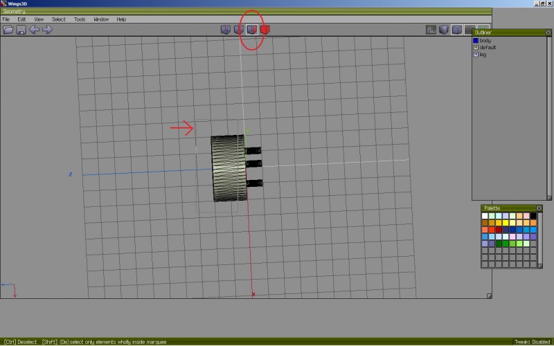Markering i Wings3D kan vara lite besvärlig men ett sätt som oftast fungerar är att välja ytmarkering (kuben med röd ytmarkering) och dra ut en markeringsruta som täcker den delen av modellen du vill markera.