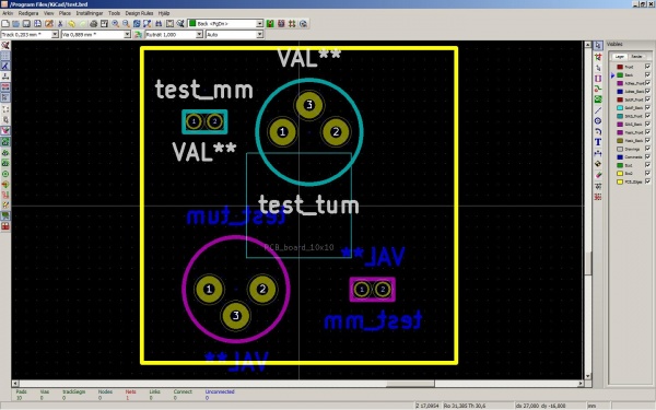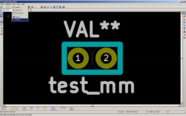 Jag har här skapat en ny modul med 2 lödöar med 2mm rastermått och kallat den Test_mm.